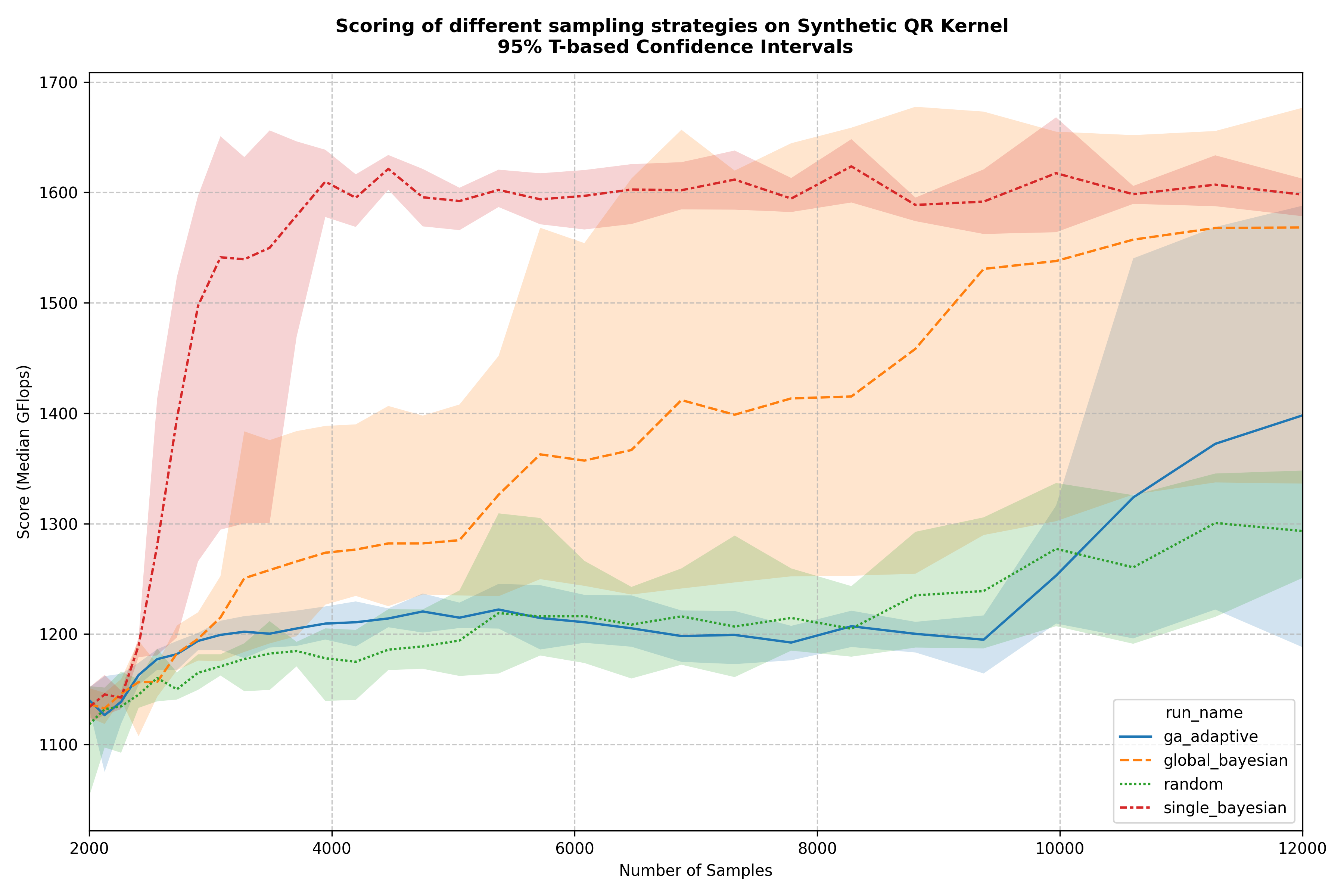 Prof Example - (SPR): Geometric mean Speedup (higher is better) against the MKL reference configuration on dgetrf (LU), depending on the sampling algorithm. 46x46 validation grid. 7k/15k/30k denotes the samples count. GA-Adaptive outperforms all other sampling strategies for auto-tuning. With 30k samples it achieves a mean speedup of \(\times 1.3\) of the MKL dgetrf kernel.
